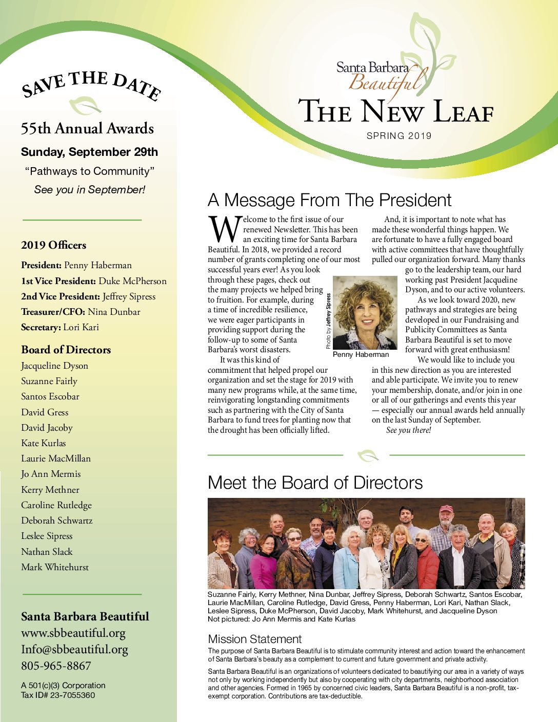 “It is an honor and a pleasure to greet you as this year’s President of Santa Barbara Beautiful. After a year-long worldwide challenge met here with perseverance and resilience, we are cautiously optimistic and look forward to creative new beginnings. We truly appreciate the support you have continued to show us during this difficult time. Your support helps us keep Santa Barbara Beautiful. We couldn’t do it without you!”