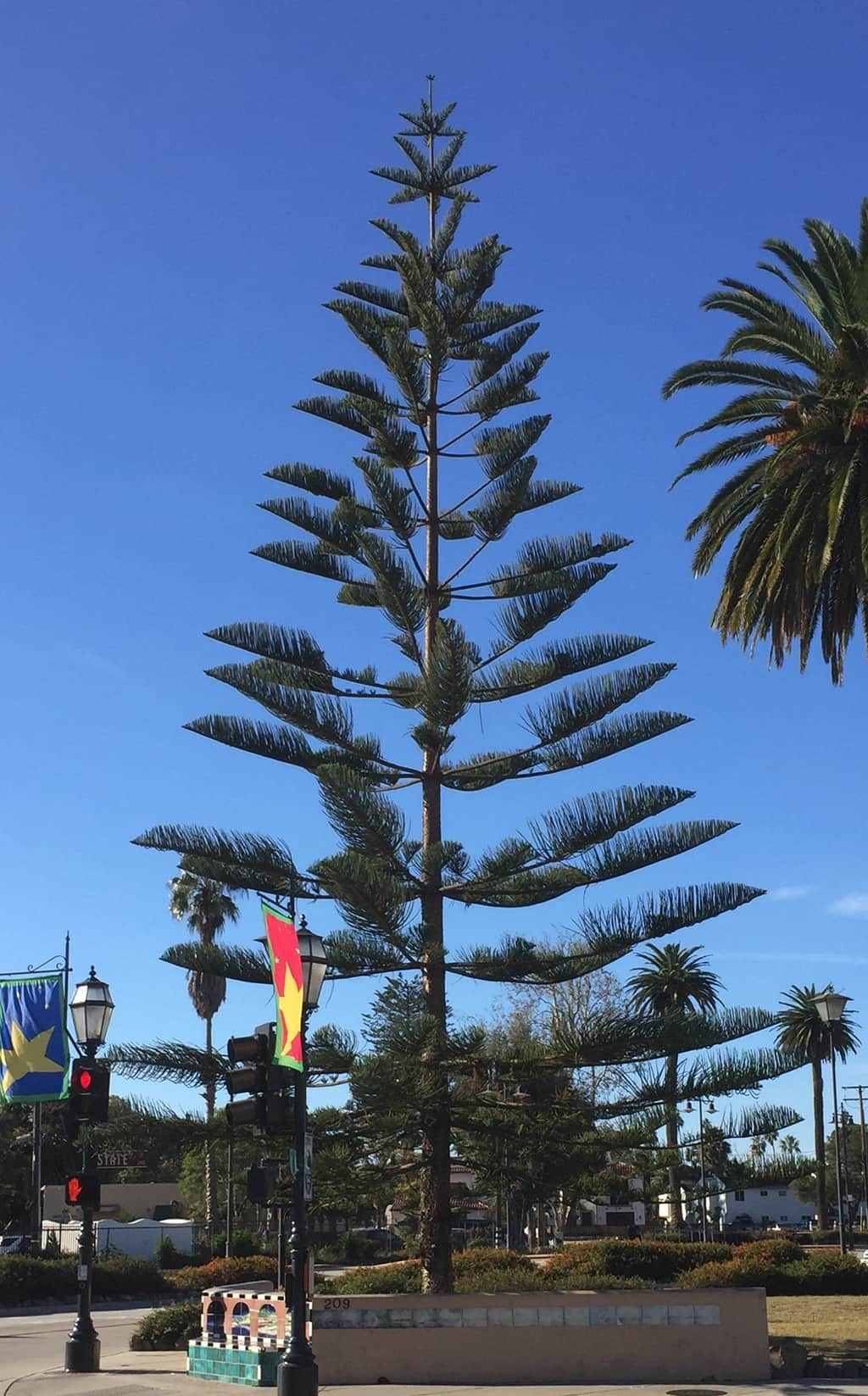 Santa Barbara’s skyline is punctuated with the upper spires of many handsome Norfolk Island Pines – commonly known as “Star Pines” for their remarkably star-shaped top whorl of branches.