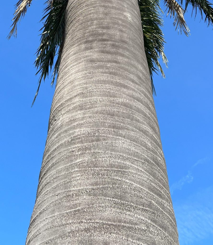 At maturity, the trunk is widest at the base, three- to five-feet (or more!) in diameter. After attaining some 30- to 40-feet in height, the trunk gradually narrows to half of that width. This narrowing results in a fully grown palm having the appearance of an elongated wine bottle – and makes identification easy. In addition to its tremendous size and odd shape, the elephant-gray trunk is further distinguished by its smooth texture, which is only marred by faint horizontal scars where shed fronds had previously been attached. It is astoundingly hard – as if made from gray concrete.